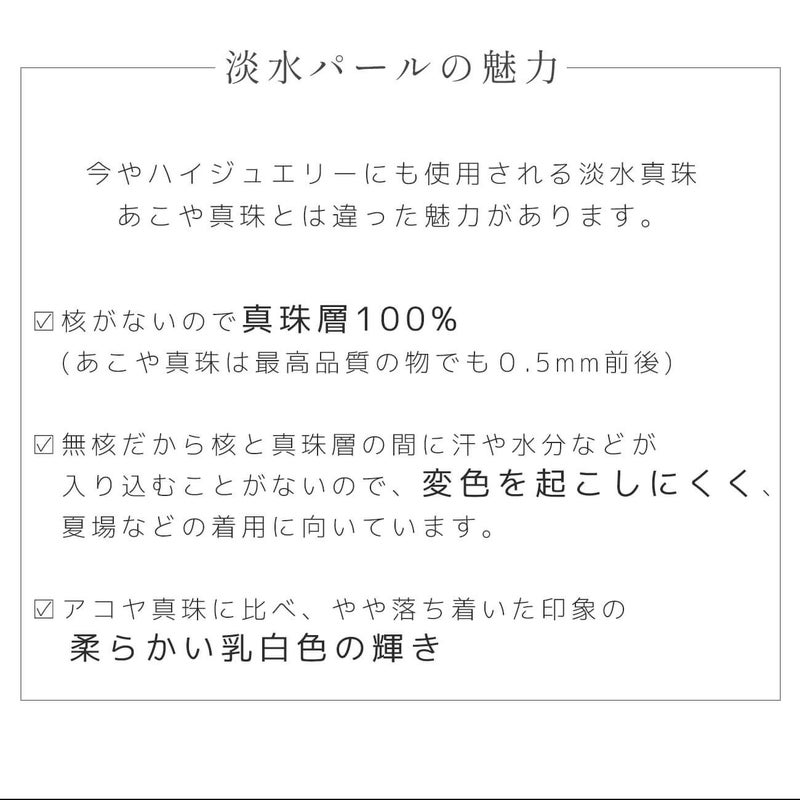パールには個体により小さな凹凸や、真珠層が巻いていく際にシワのようになったものなどがあります。これは貝が真珠を育む過程でつくものであり、製品の不良ではございません。